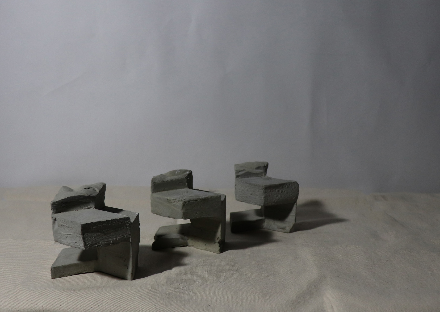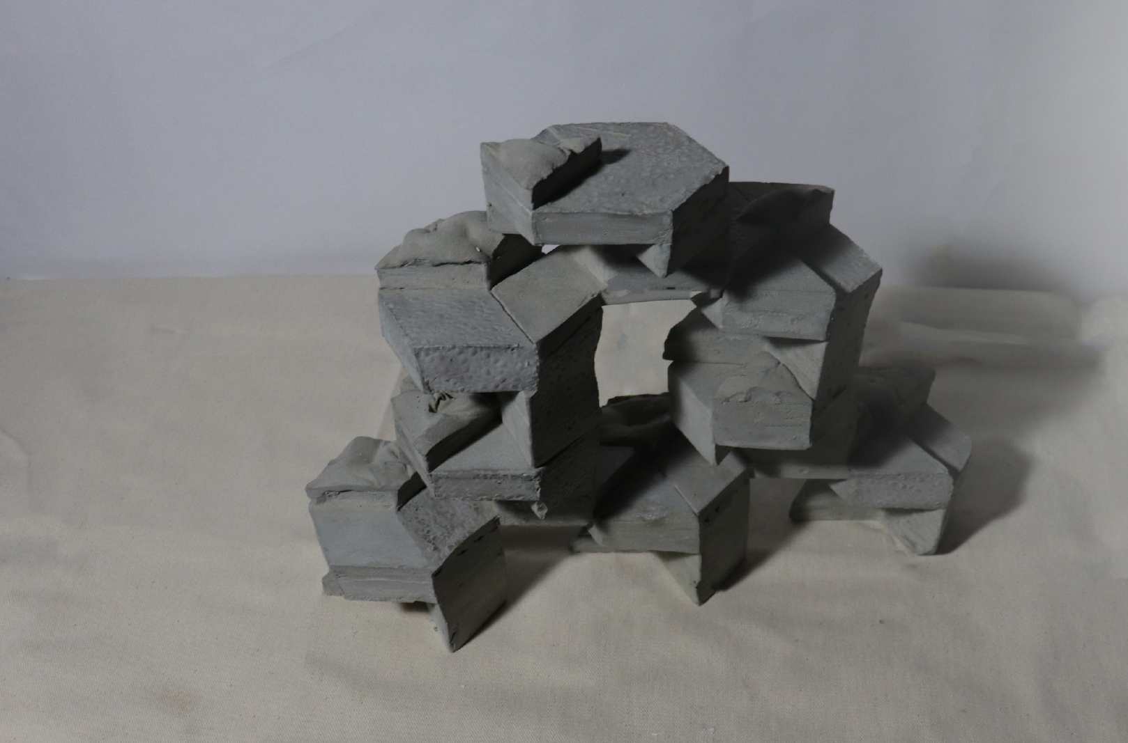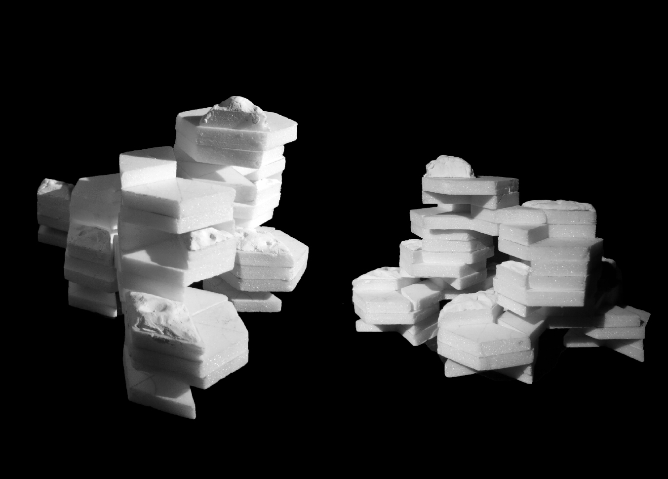 我選擇的自然物是淡色庫蚊的卵,從兩個尺度去分析。一是大尺度的蚊子蛋生成順序,如S形般的排列,再者是小尺度的蚊子卵表面,它通過互相連接的微小結構捕捉薄層空氣,使卵能浮在水的表面。之後以自然物的基本型-六角形去做變化,並以此用正三角形去做加減,創造出單元之間的卡榫與單元排列後空間虛實的變化。模型單元之間共用結構,如同蚊子卵表面緊密的單元,每堆疊一層,就可以選擇是否逆時針旋轉30度,以此不斷往上與往四周延伸。同時部分以流水紋板和布做模具,在表面製作出特殊的有機形。