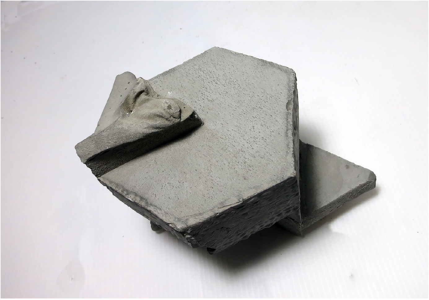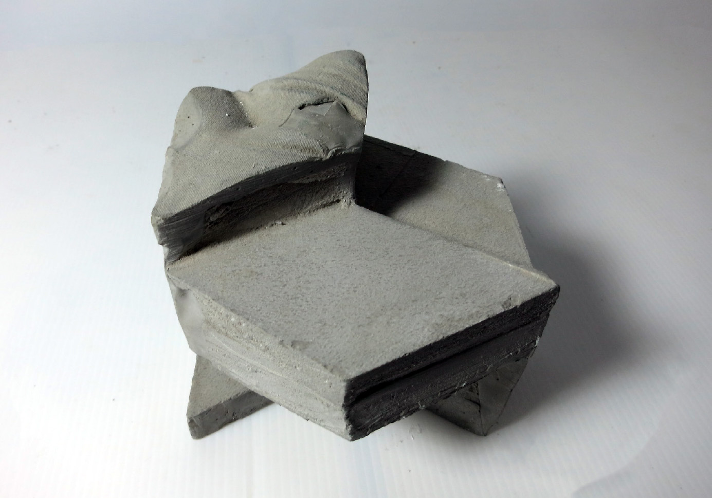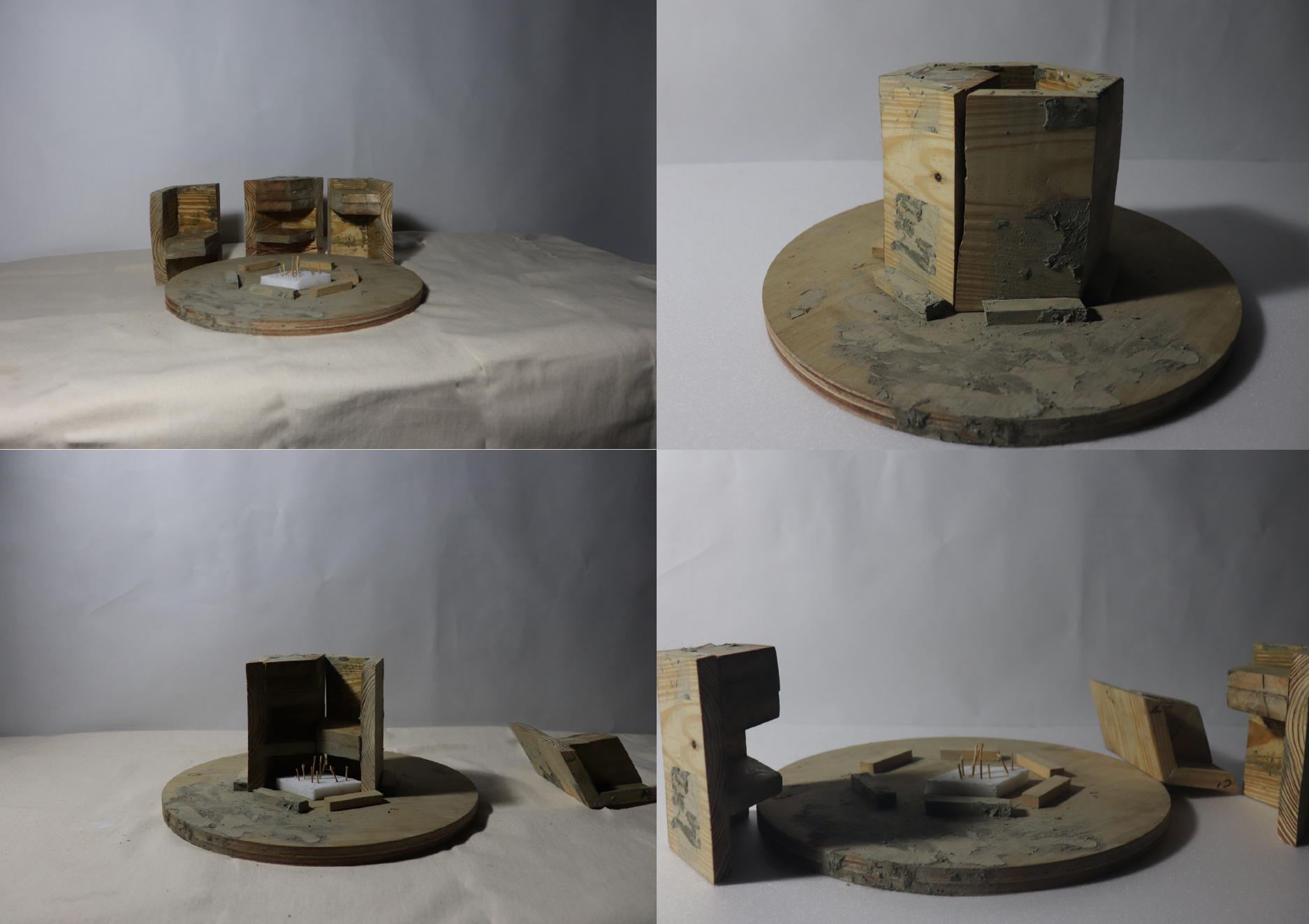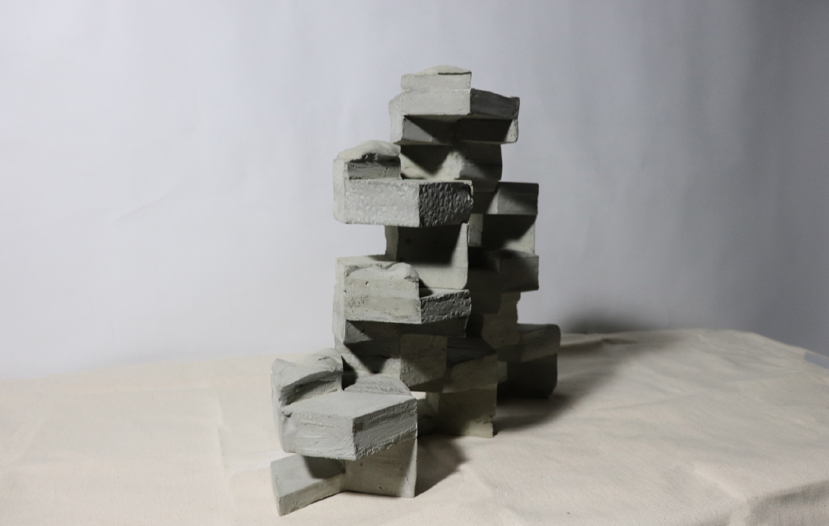 我選擇的自然物是淡色庫蚊的卵,從兩個尺度去分析。一是大尺度的蚊子蛋生成順序,如S形般的排列,再者是小尺度的蚊子卵表面,它通過互相連接的微小結構捕捉薄層空氣,使卵能浮在水的表面。之後以自然物的基本型-六角形去做變化,並以此用正三角形去做加減,創造出單元之間的卡榫與單元排列後空間虛實的變化。模型單元之間共用結構,如同蚊子卵表面緊密的單元,每堆疊一層,就可以選擇是否逆時針旋轉30度,以此不斷往上與往四周延伸。同時部分以流水紋板和布做模具,在表面製作出特殊的有機形。