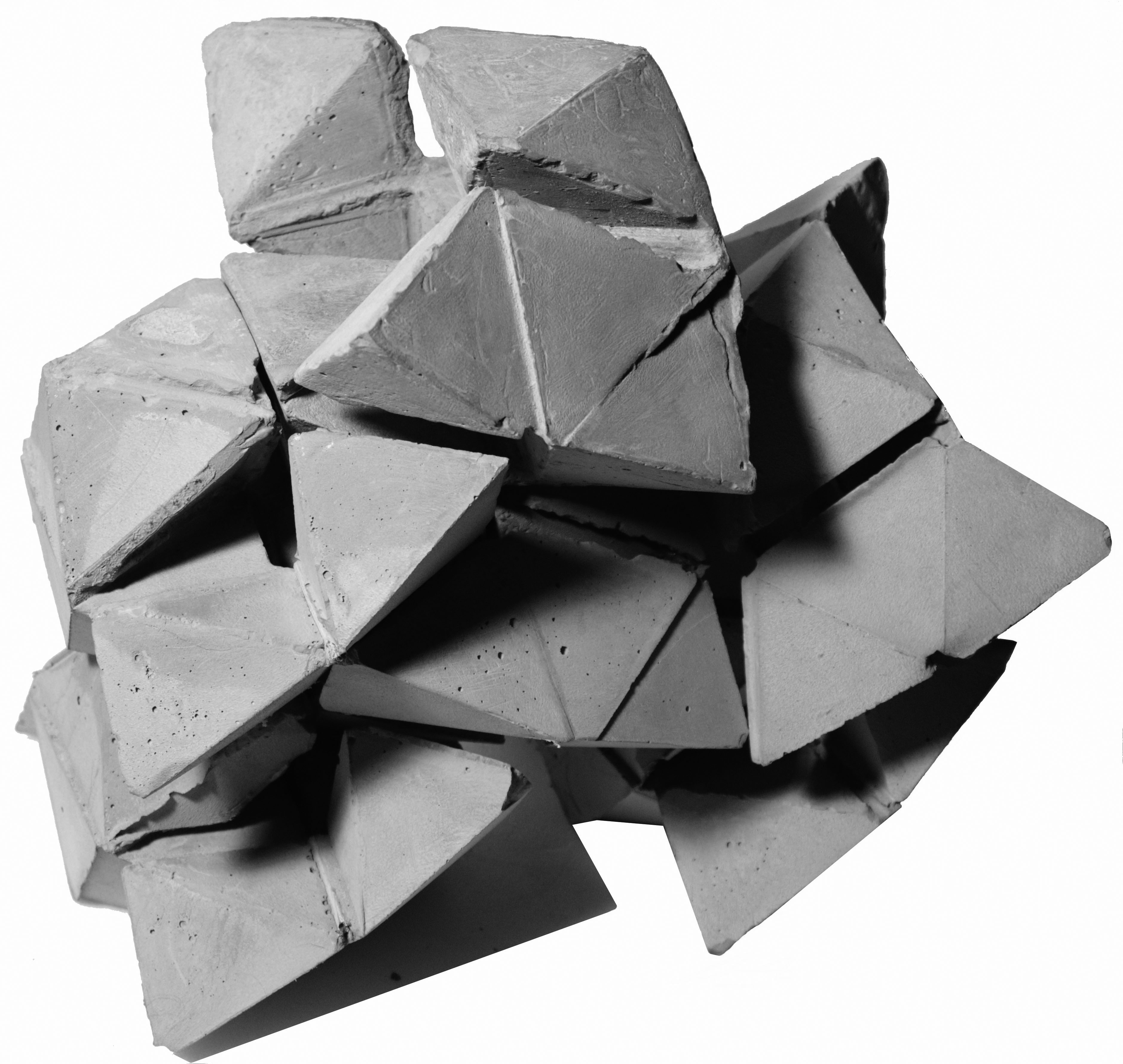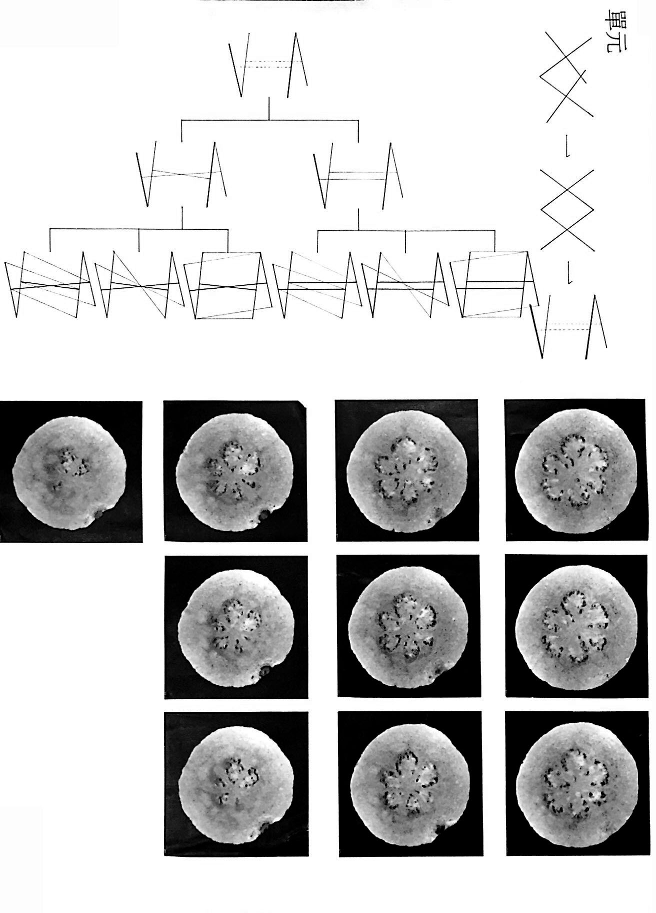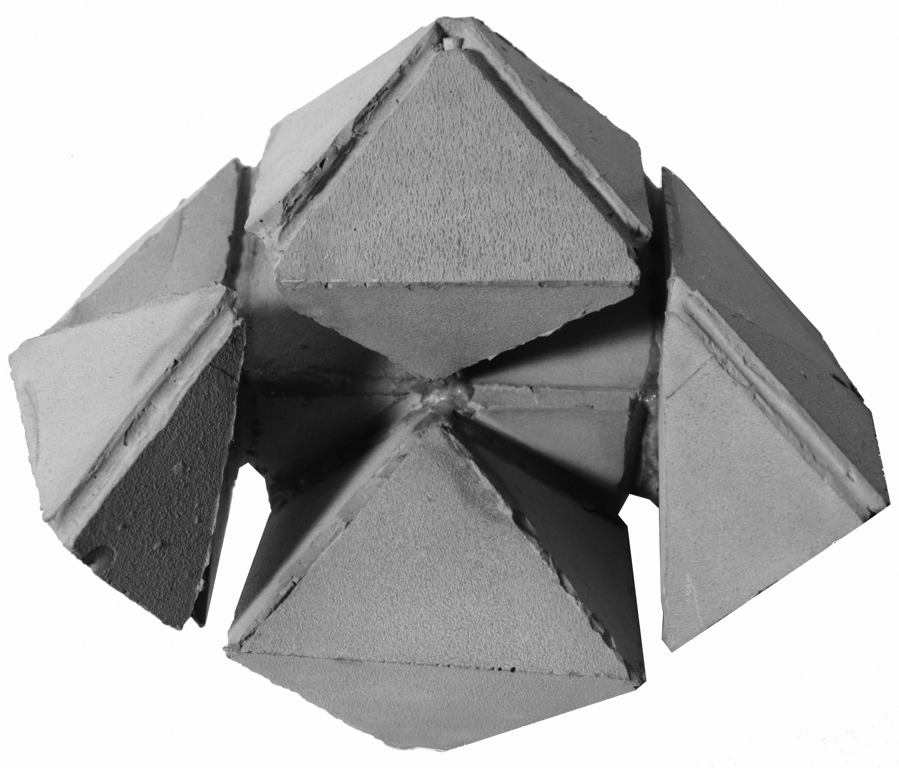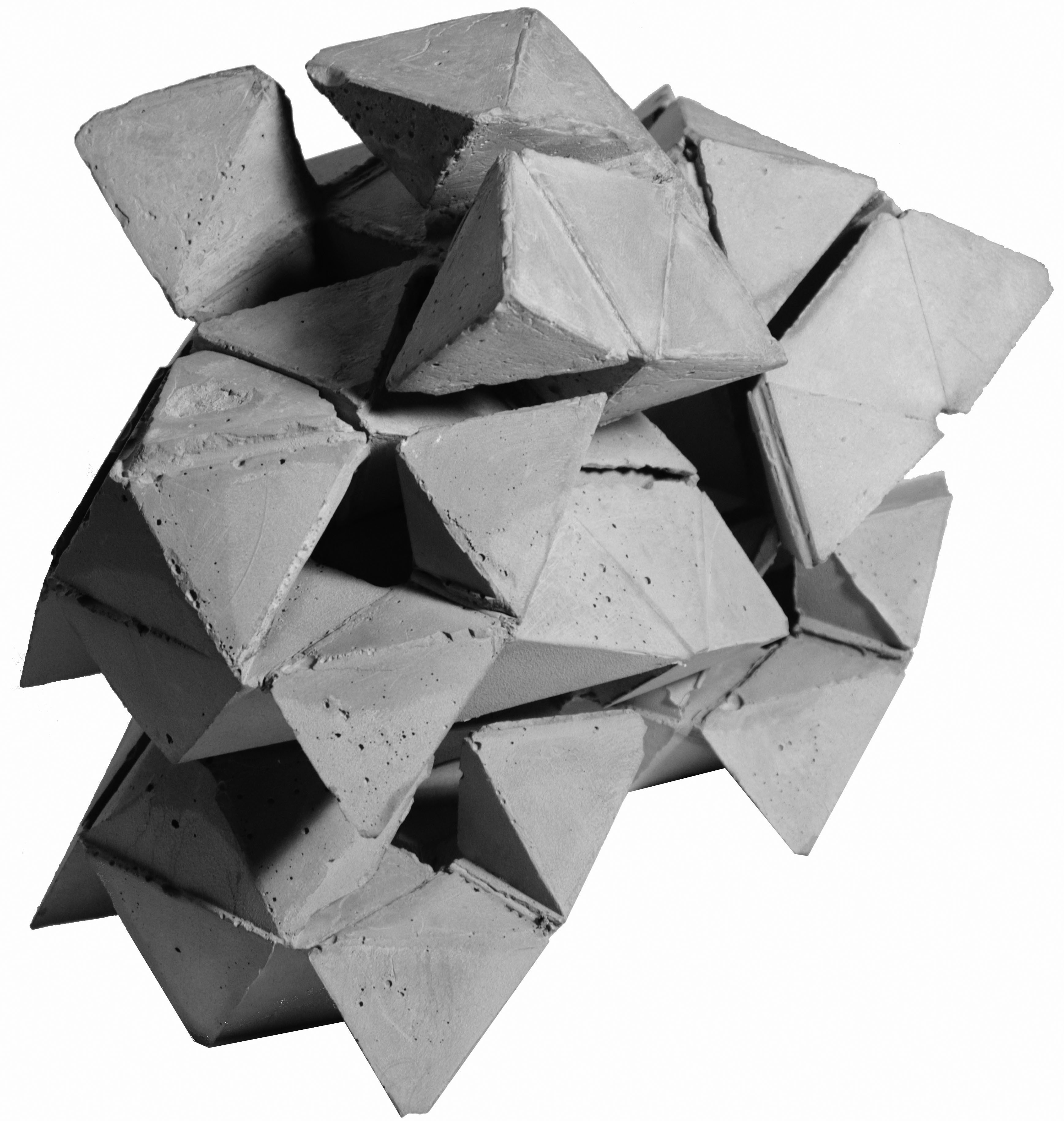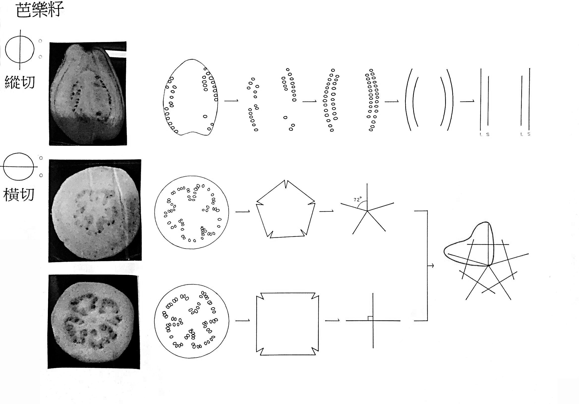 先觀察芭樂籽的剖面再簡化、疊合形狀,再從中找出重複的樣式,以這個樣式作延伸。之後再分析觀察芭樂籽的生長過程找出規則,並從先前的樣式以這些規則做發展,創造出必然的架構,最後以隨機貼補這個新的架構做成偶然的模具,灌注出單元。