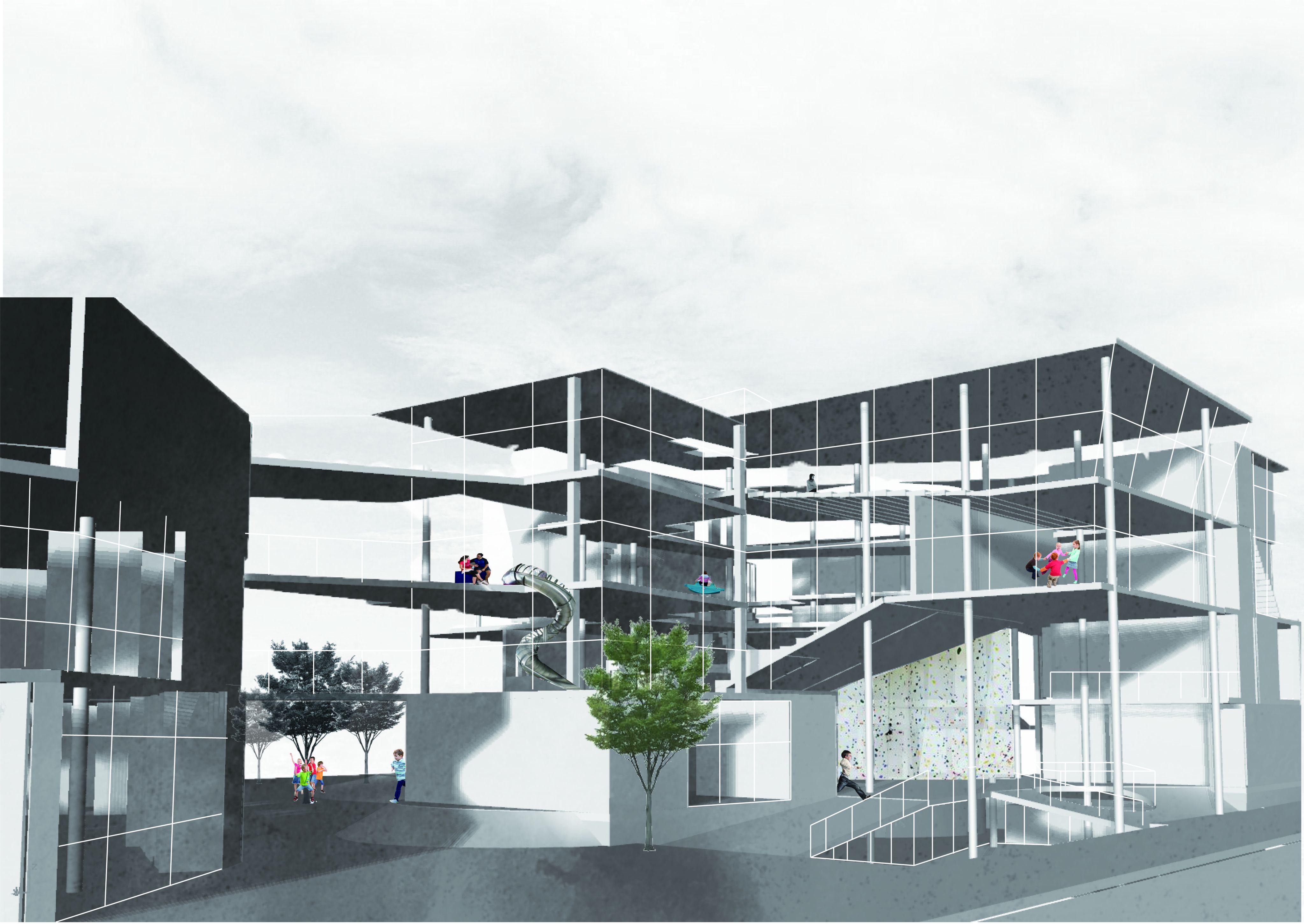 小學作為一個學習場所,巨觀來看代表一趟六年的旅程,隨著年齡增加,對於物件及學習認知的尺度感受都不一樣。 而微觀的日常中透過不斷遊樂與探索,在每個階段都能找到自己心中的秘密基地,堆砌出六年日常的成長。 就像幼兒之城建築師日比野拓所說: "大人應該收起太多自己的想法,去觀察每個孩子,看他們喜歡什麼, 有何長處與短處,並提供他們體驗的機會,那怕是受傷。" 另外與社福機構共構,期望能解決社區的問題之外也為南機場注入新的活力與潛力。