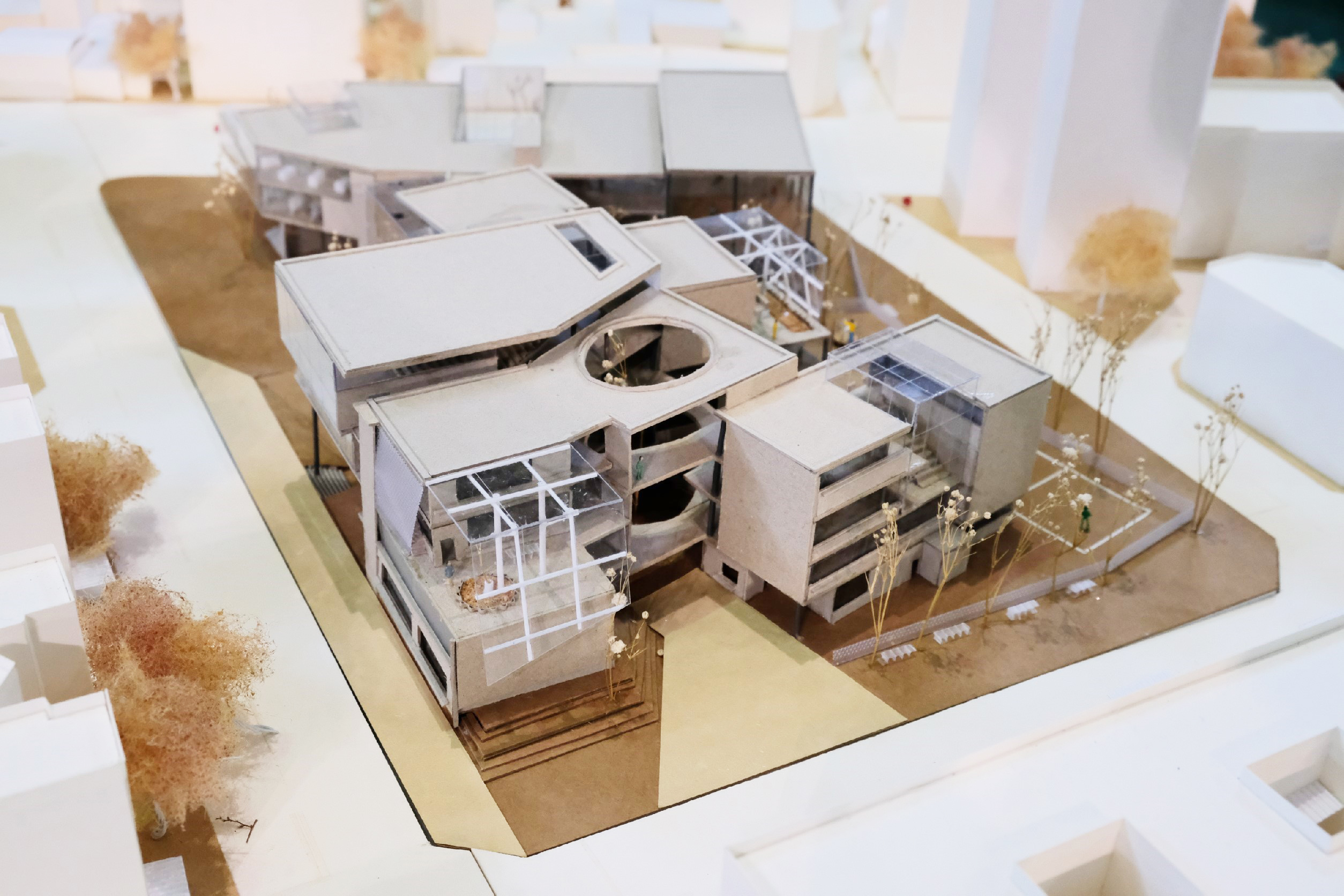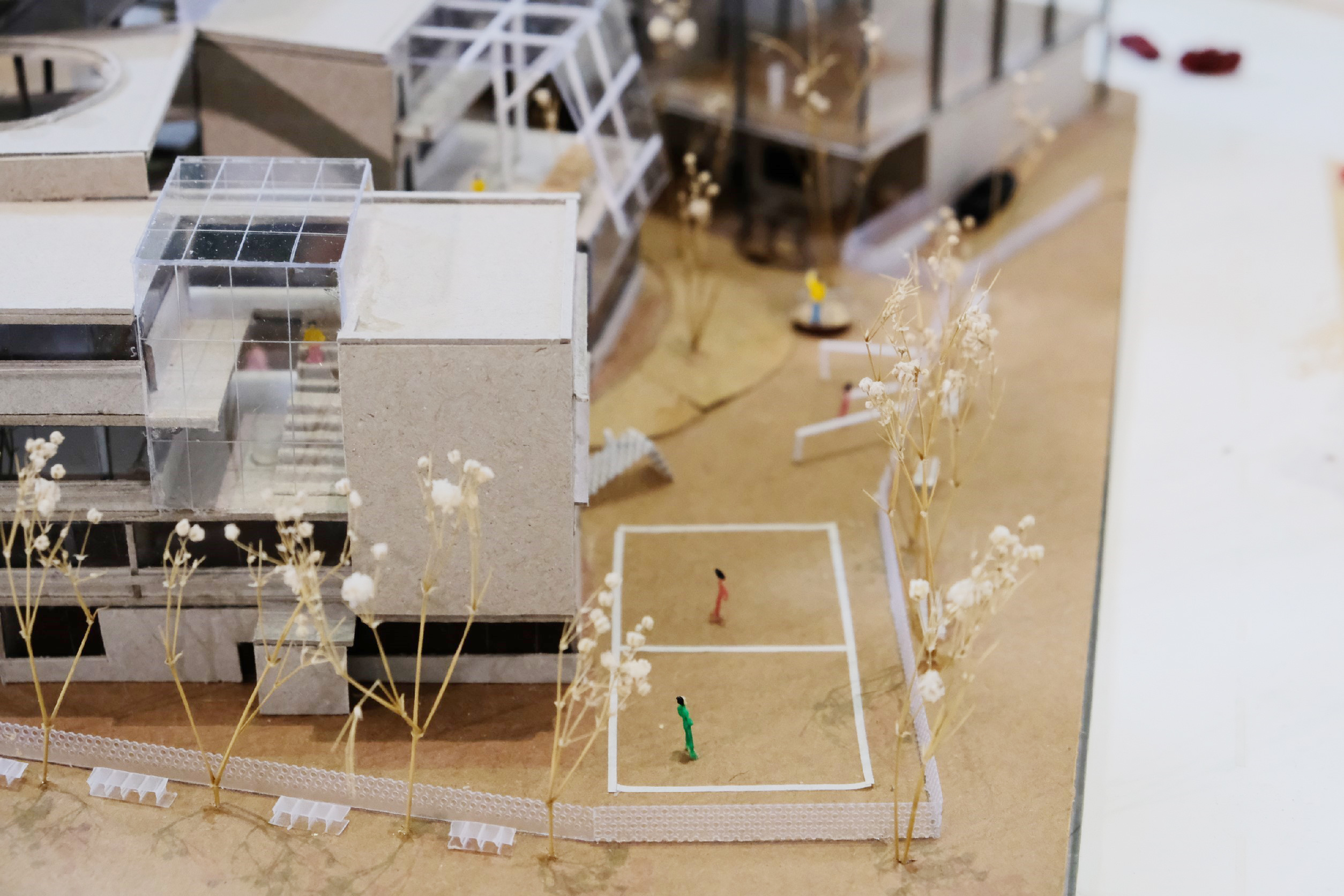 配置方面以基地周遭的量體之間圍塑出的開放空間之視角產生切線,其重疊區域創造一條貫穿社福機構 與校園的軸線,並讓活動延軸線展開,孩童們的遊樂動線環繞著軸線中心。 從小學生一天日常中擷取出活動行為的元素,這些元素構成活動的場所,是一種標示性,當一系列的物件被置入基地時,活動也被建構。