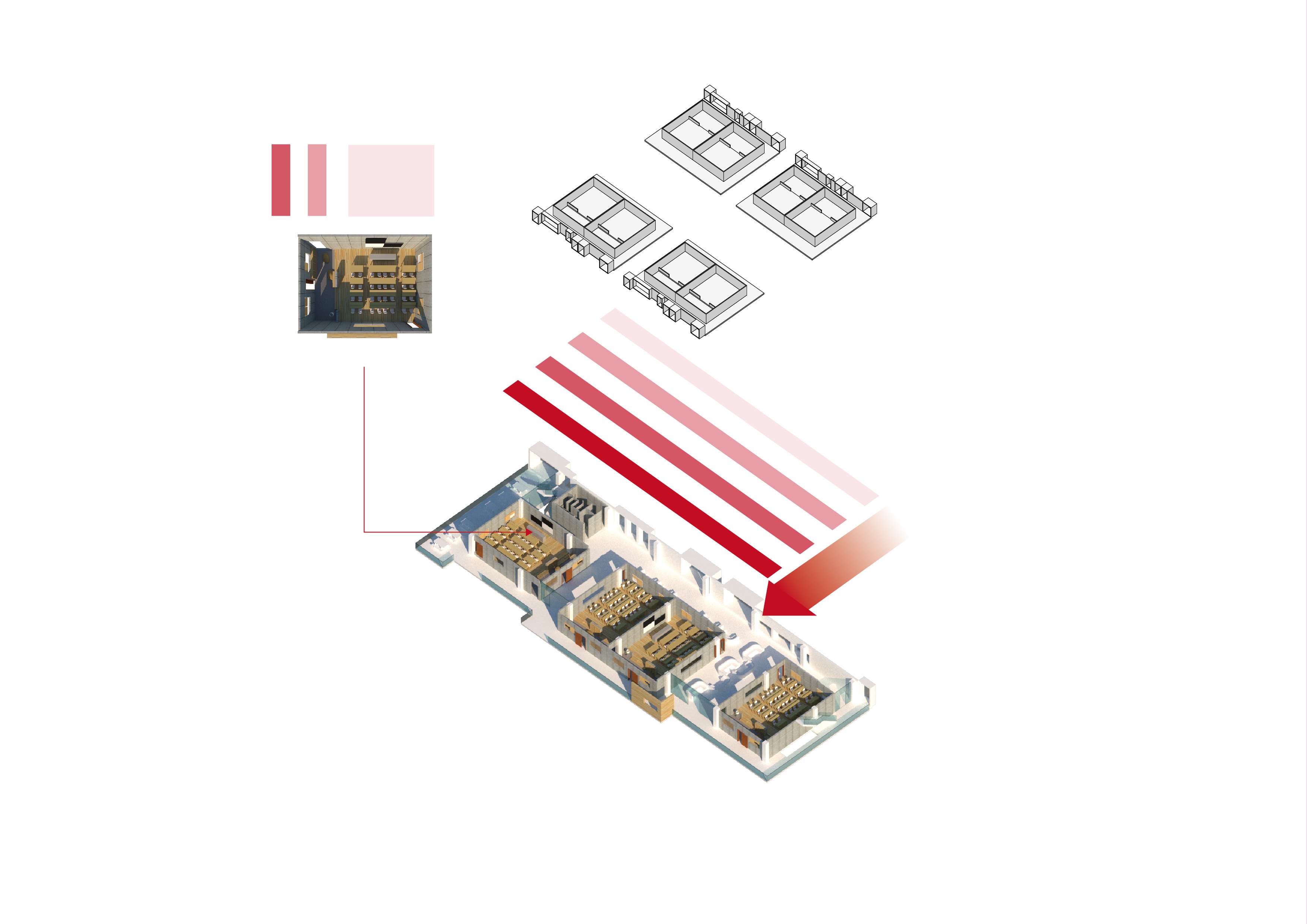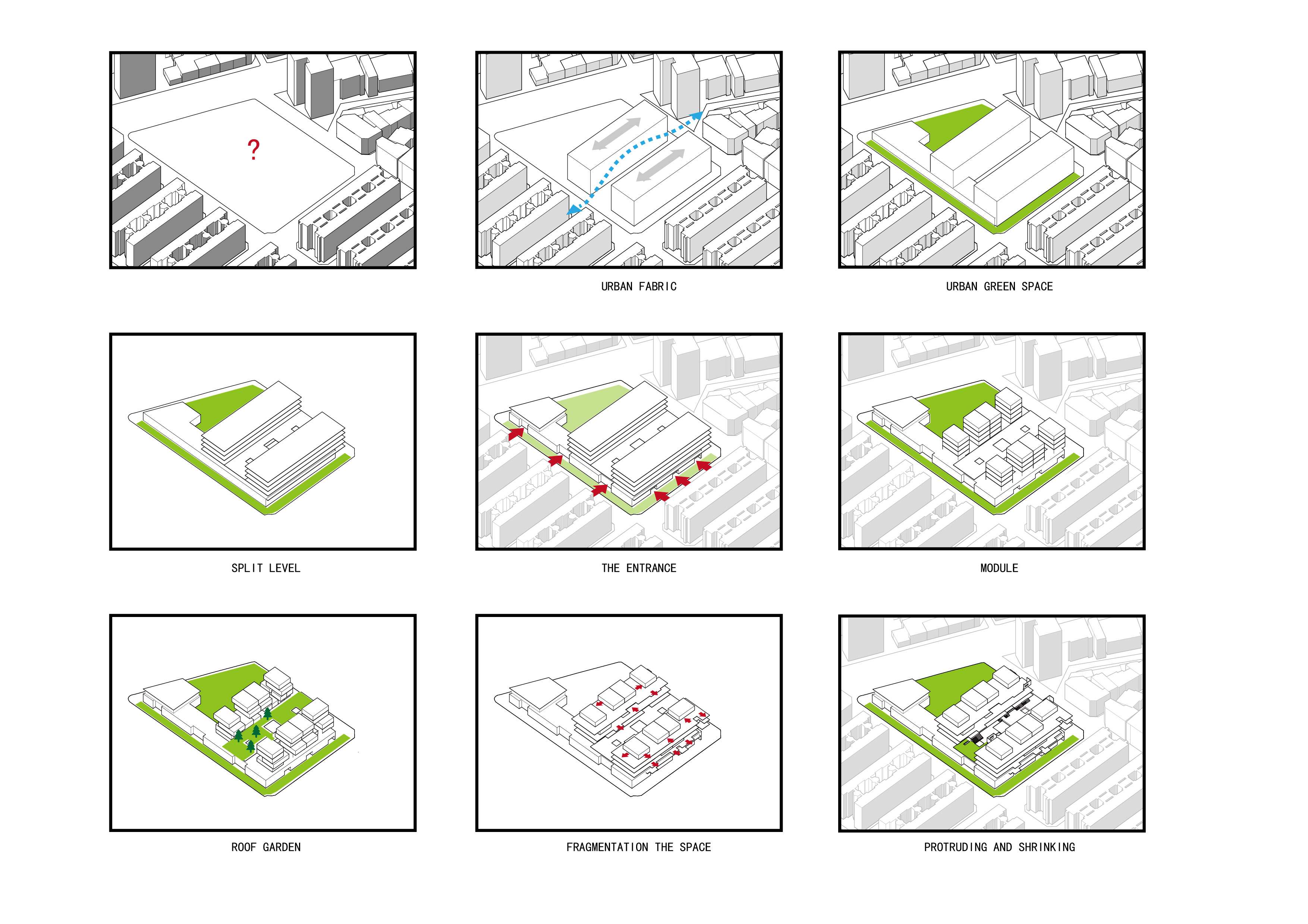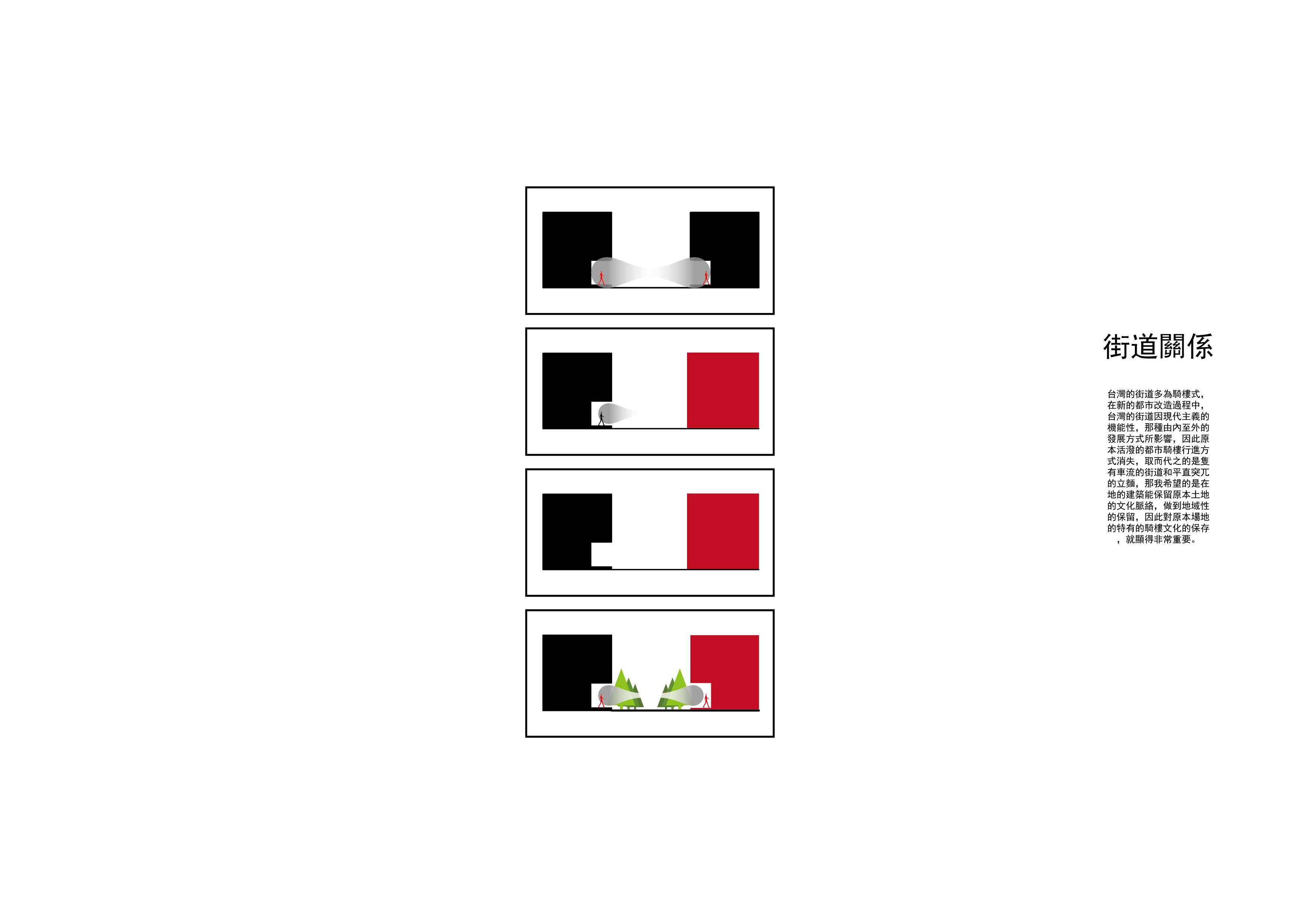 我的切入點是將原有的城市的紋理與記憶,在新的場所進行轉譯,並進行一部分的重現,我透過觀察南機場跟城市周邊的紋理等,南極場建築形式,立麵造型,南極場公寓內部動線組織等,由大到小將其與我的空間對應,將建築作為一個舊與新的中介物。