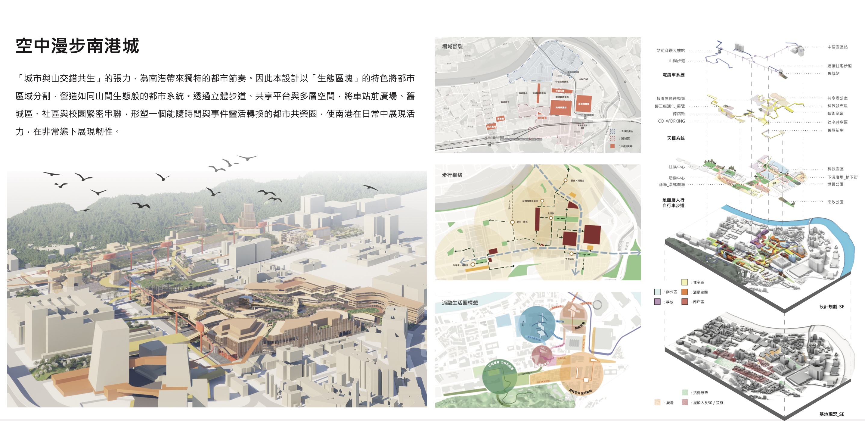 「城市與山交錯共生」的張力,為南港帶來獨特的都市節奏。本設計以「生態區塊」的特色將都市區域分割、立體跨域連結,營造出山間生態般的都市系統。多節點的交織讓不同生活圈能靈活對應多樣化需求,使都市空間展現更高的適應力。