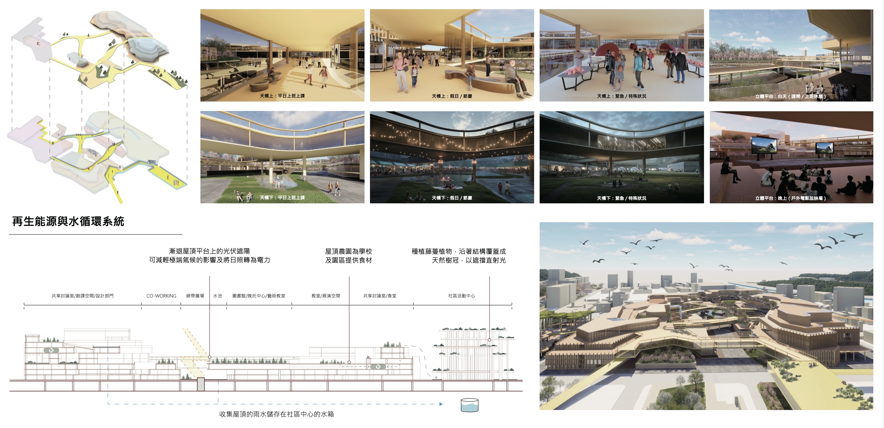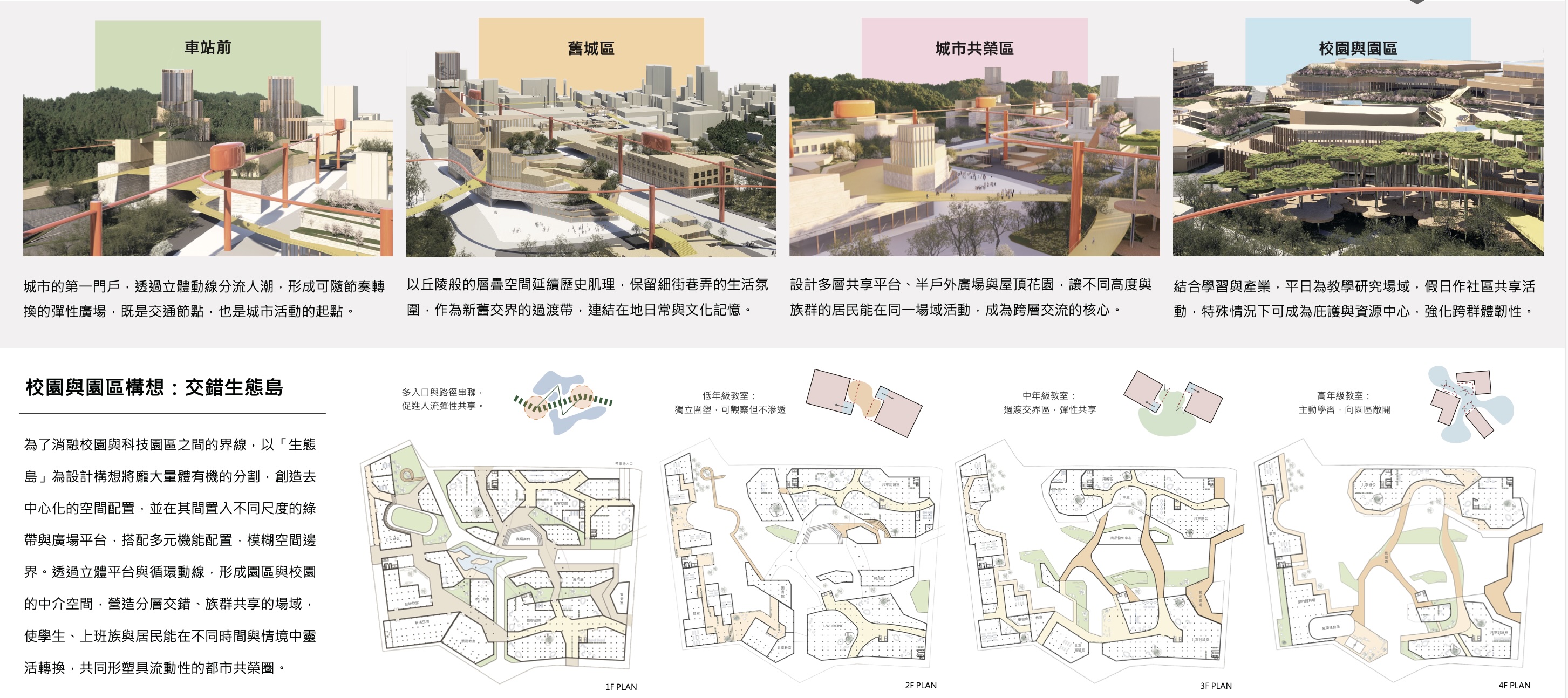 特別是園區與校園的銜接被視為關鍵介面,透過多元機能空間、立體平台與循環動線,營造分層交錯、族群共享的中介場域,形塑一個能隨時間與事件靈活轉換的都市共榮圈,使南港在日常展現活力,亦在非常態下展現韌性。
